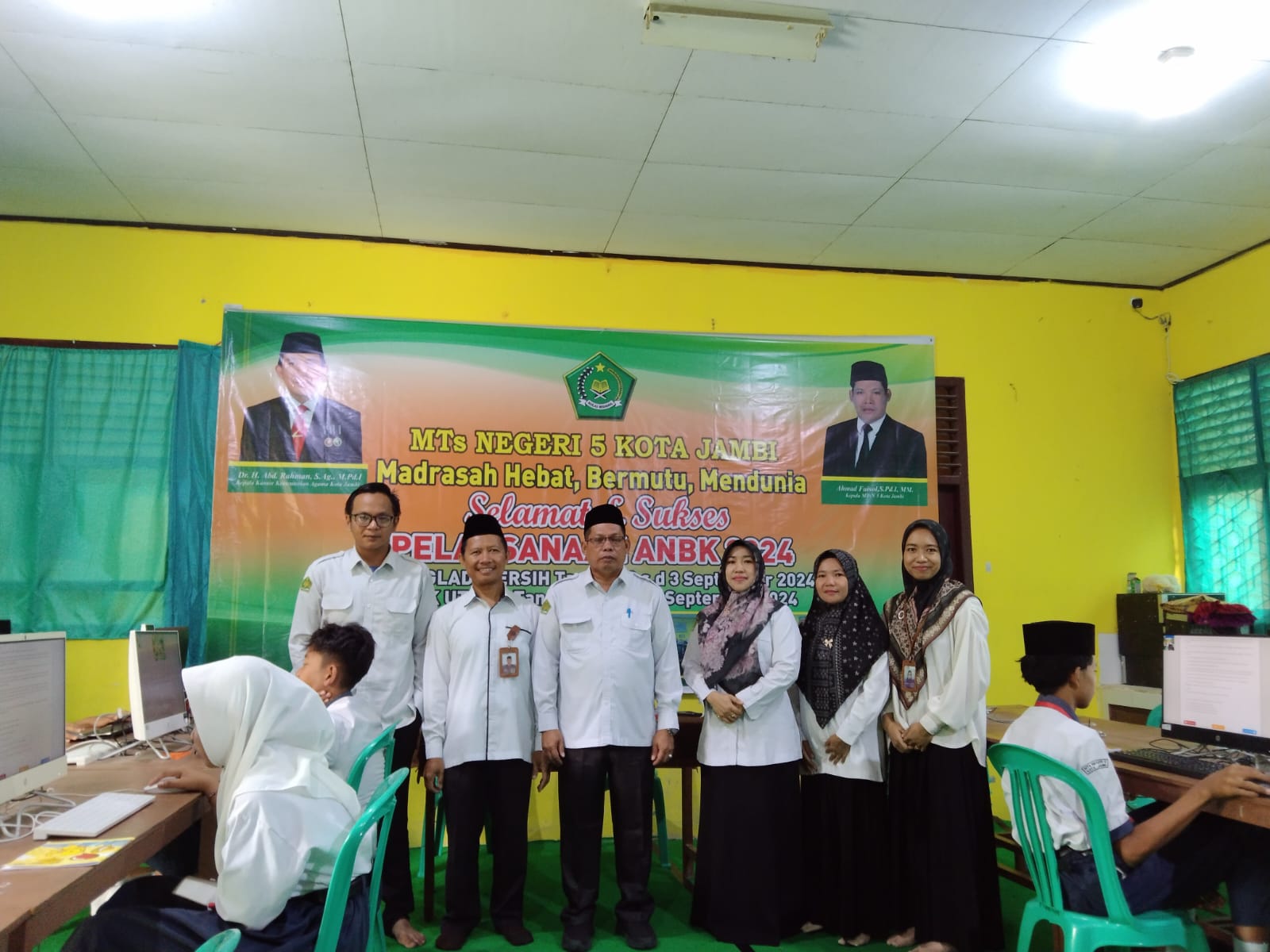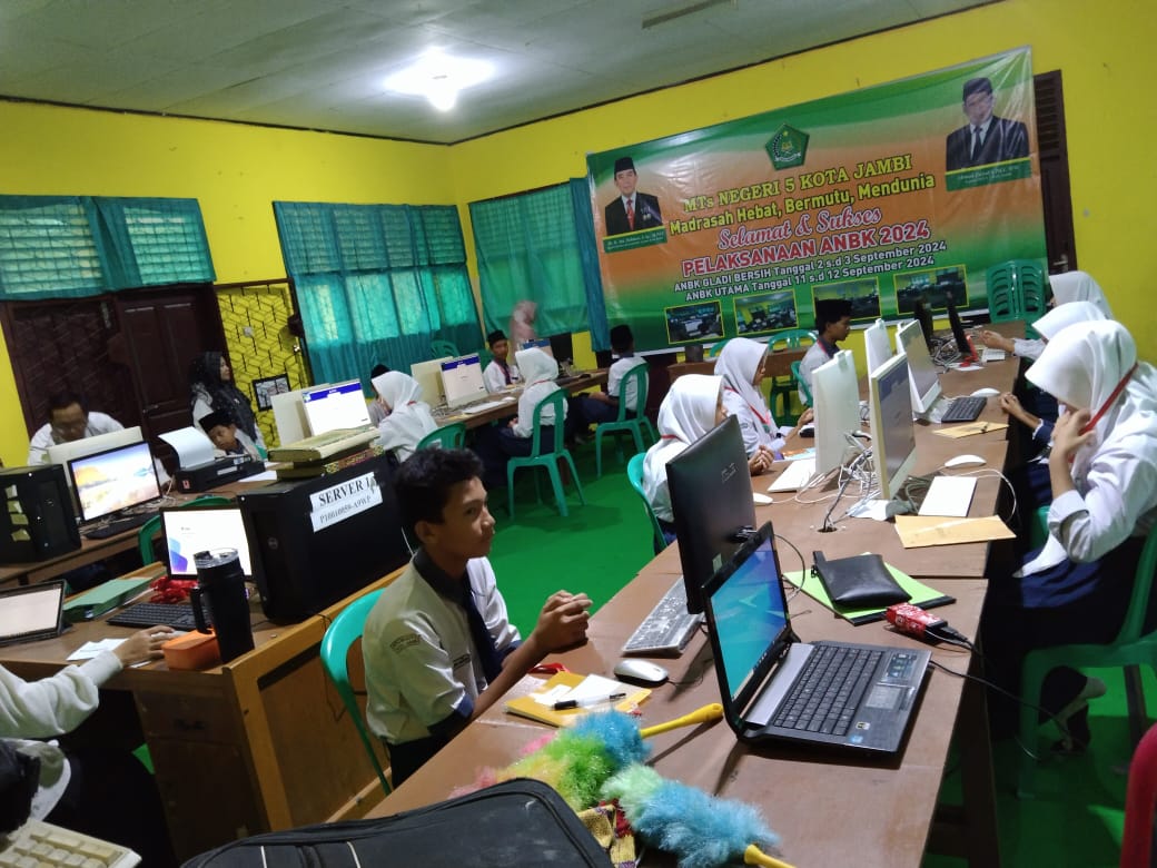 Kota Jambi,Selasa, (10/09/2024), Bertempat diruang Laboatorium Komputer MTN 5 Kota Jambi, berlangsung Asesmen Nasional Berbasis Komputer ( ANBK ). Asesmen ini diikuti oleh 45 peserta didik dari kelas 8 , pelaksanaan Asesmen Nasional Berbasis Komputer ( ANBK ) berlangsung dalam tiga sesi, Sesi pertama dimulai dari pukul 07.30 sampai pukul 09.40, Sesi kedua berlangsung dari pukul 10.20 sampai pukul 11.40 sedngkan Sesi tiga berlangsung dari pukul 14.20 sampai pukul 16,30.