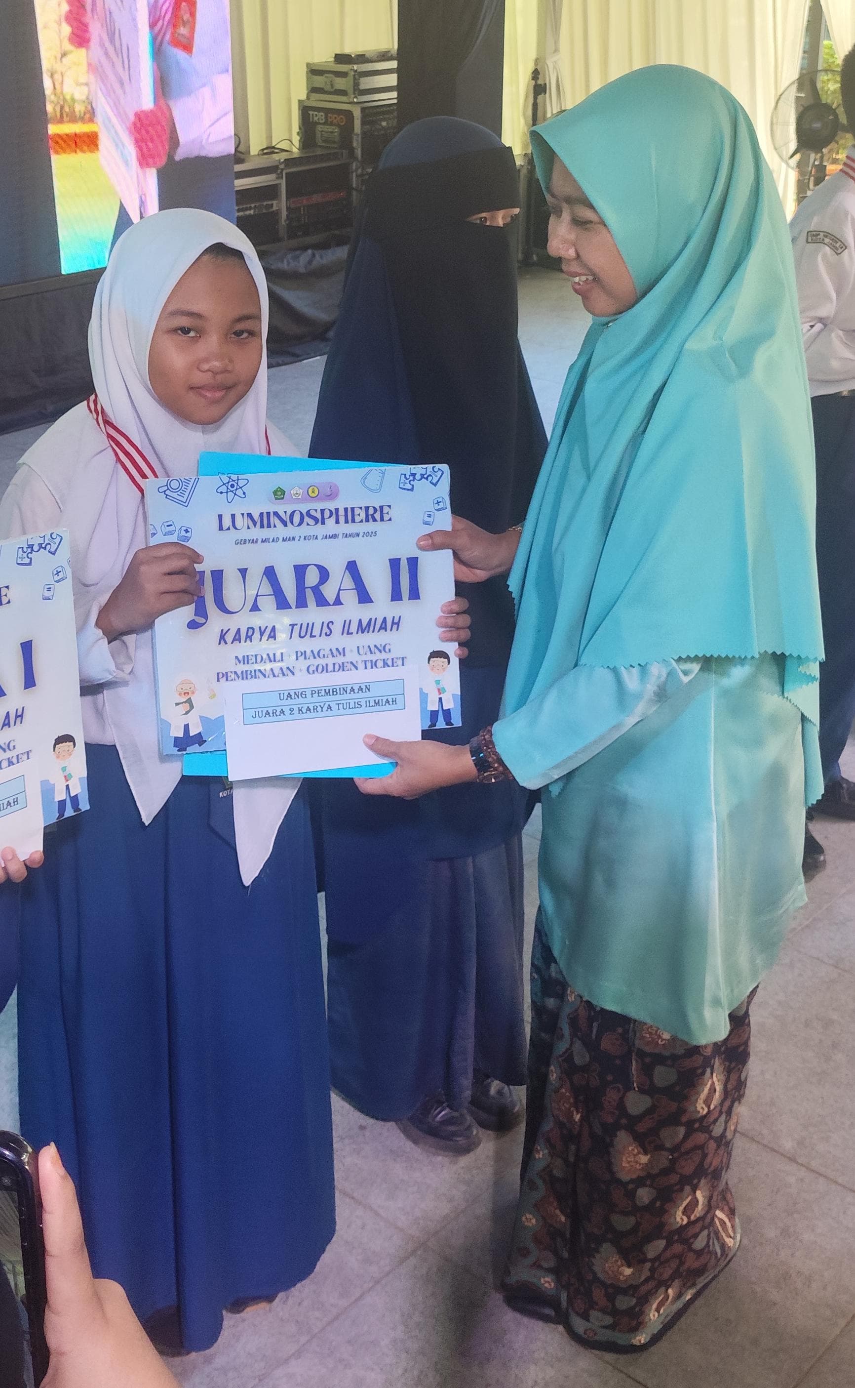 Kota Jambi ( MTsN 5 Kota Jambi ). SIswi MTsN 5 Kota Jambi kelas 8 dan kelas 9, atas nama ananda aline dan nahda berhasil mengharumkan nama MTsN 5 Kota Jambi. Mereka berdua berhasil meraih juara 2 dan 3 dalam perlmbaan ceramah dan karya tulis ilmiyah yang diselenggarakan di MAN 2 Kota Jambi.