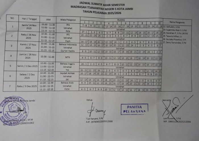 Kota Jambi ( MTsN 5 Kota Jambi ) Madrasah Tsanawiyah Negeri (MTsN) 5 Kota Jambi menggelar ujian sumatif akhir semester dengan sistem dua sesi. Kebijakan ini diterapkan untuk memastikan kelancaran pelaksanaan ujian serta menjaga ketertiban di lingkungan Mdrasah serta menghindari kecurangan yang mungkin terjadi selama pelaksanaan ujian.