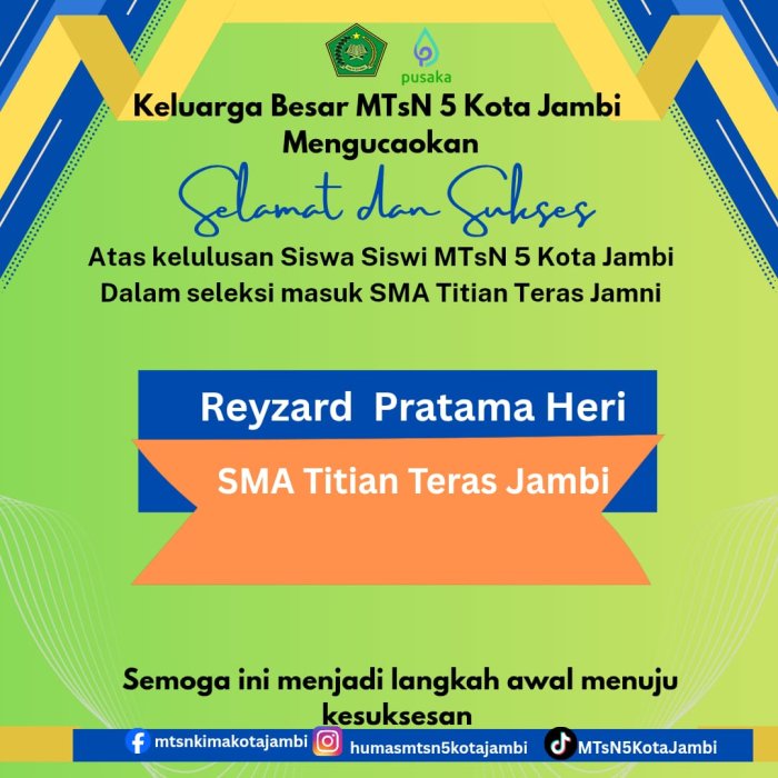 Kota Jambi ( MTsN 5 Kota Jambi ) Tiga siswa dari MTsN 5 Kota Jambi berhasil lolos seleksi masuk ke sekolah unggulan di Provinsi Jambi. Dua siswi dan satu siswa tersebut diterima di Madrasah Aliyah Negeri Insan Cendekia (MAN IC) Jambi dan SMA Titian Teras Jambi. Adalah Nahda Sazkia dan Khairani Al Maghfiroh Munandar berhasil lolos ke MAN IC Jambi dan Reyzard Pratama Heri berhasil lolos ke SMA Titian Teras Jambi. Ketiga siswa siswi ini merupakan siswa yang berprestasi dalam bidang akademik di Madrasah.