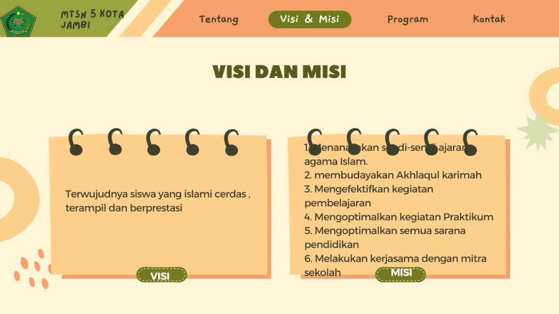 VISI : " TERWUJUDNYA SISWA YANG ISLAMI, CERDAS, TERAMPIL, DAN BERPRESTASI"