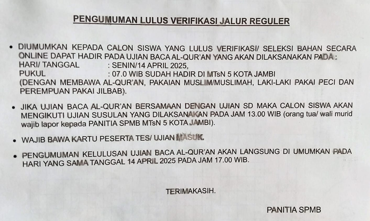 Seleksi Pendaftaran Murid Baru (SPMB) MTs Negeri 5 Kota Jambi tahun pelajaran 2025/2026 telah dibuka dengan 3 jalur pendaftaran.